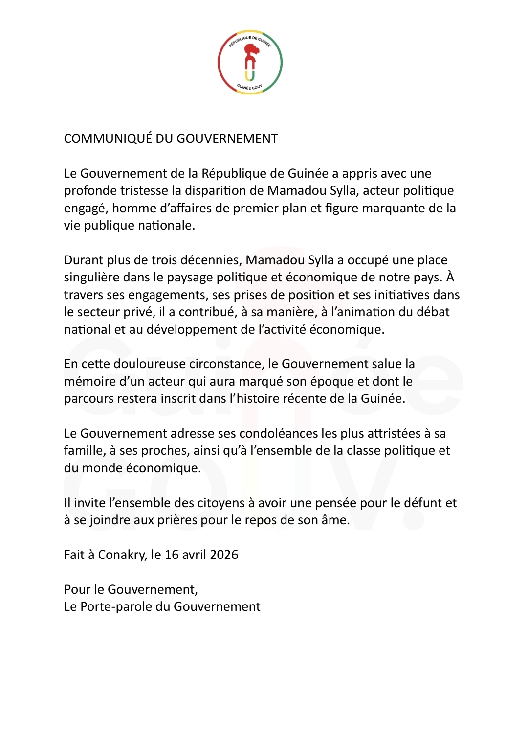 Le Gouvernement guinéen a réagi officiellement au décès d’Elhadj Mamadou Sylla, survenu dans la nuit du 15 au 16 avril 2026 à Conakry, en saluant la mémoire d’un «acteur politique engagé» et d’un «homme d’affaires de premier plan».